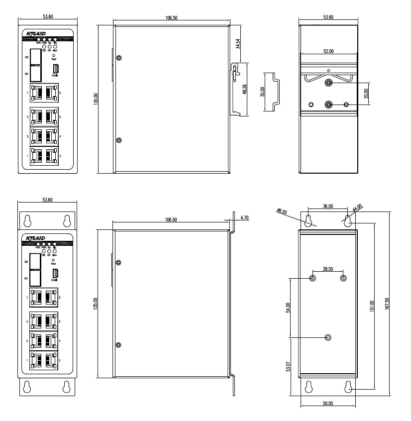| Management and Maintenance | Supports Console, Telnet, WEB management methods Supports SNMPv1/v2c/v3, Kyvision centralized management Supports software upgrade by SFTP/HTTP Supports Power alarm, IP/MAC conflict alarm, Memory/CPU usage alarm, Port alarm, Ring alarm, Port traffic alarm, CRC error and packet lose alarm, SFP port RX power alarm and TX power alarm Supports DDM (SFP port) Supports loop detection Supports RMON Supports port mirroring Supports Syslog Supports LLDP Supports Link-check Supports EtherNet/IP, Modbus/TCP Supports IPv4/IPv6 |